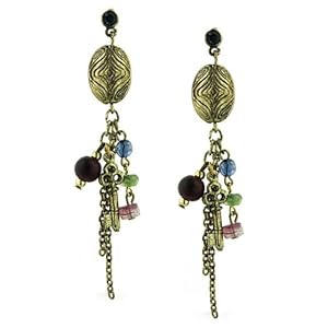 Rich in color and texture, these dangle charm earrings have a Montana blue crystal at the post followed by an oval golden brass bead stamped with an intricate pattern. Below the bead dangles brass tone chains, a miniature key charm, and jewel tone beads and stones.