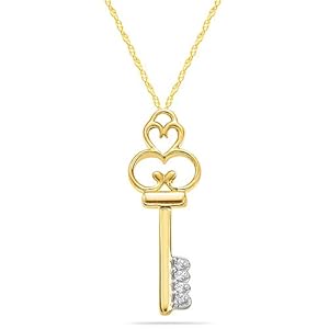 The key to coveted style, this fancy gold pendant looks elegant with any outfit. The vintage-style skeleton key design is crafted in polished 10 karat yellow gold with a heart-motif openwork scroll top. Four petite round diamond accents (.03 cttw) add a note of luxury to the design. The small pendant is showcased on an 18-inch light rope chain. Enjoy it with the chain provided, or choose a different gold chain from our wide selection. Diamond Clarity: No two diamonds are alike. A diamond's most distinguishing characteristics are its inclusions, marks that are often invisible to the naked eye. However, under a jeweler's magnifying loupe or microscope they can look like crystals, tiny rivers, or clouds. A diamond's clarity is determined by the presence or absence of inclusions--fewer inclusions mean better clarity--and how visible they are. The greater a diamond's clarity, the greater its brilliance and value. A diamond categorized as internally flawless will have no inclusions, but this is extremely rare. Diamond Color: Though diamonds come in a wide range of colors, colorless diamonds have traditionally been considered the most valuable. Most diamonds are graded on a scale using the letters of the alphabet, from D (colorless), the best grade, through Z (a light yellow). It is difficult for the untrained eye to notice such variations in color unless stones are being compared side by side. Diamond Carat Weight: A diamond's weight is measured in carats, with one carat being equivalent to 100 points. You will often see a diamond referred to as a 3/4-carat stone or a 75-point diamond. Larger stones are often more highly valued, but size should not be the only consideration--high brilliance, which varies according to clarity, cut, and color grade, is highly desirable in a diamond. Diamond Certification: A diamond certificate represents independent verification that the stone purchased has all the qualities of cut, color, clarity, shape, and weight expected. It is a further indication of the condition and value of that diamond as represented on our site. Such certificates are issued by several agencies employing highly trained gemologists and provide an unbiased and accurate evaluation of the diamond. These gemologists scrutinize each stone to analyze its dimensions, clarity, cut, color, finish, symmetry, and other details. Diamonds purchased from the Amazon.com Collection may be certified by the Gemological Institute of America or the International Gemological Institute. The type of certificate provided will be noted in the product specifications of your jewelry purchase; if you do not see a certificate type noted, one will not be provided. Our Diamond Policy: Amazon.com sources high-quality diamonds from some of the world's largest suppliers. All our diamond suppliers certify that to their best knowledge their diamonds are not conflict diamonds. Diamond Care: Diamonds, as the hardest substance on earth, are resistant to damage. However, diamond jewelry is set in different metals, and care will vary from piece to piece. Diamonds should be cleaned in a solution of one part ammonia to six parts water, using a gentle scrubbing brush to remove any dirt. It is a good idea to have them cleaned once a year by a professional jeweler, at which time the security of the setting can be checked as well. Diamond jewelry should be stored in a soft cloth pouch to ensure that the stone will not scratch other jewelry.