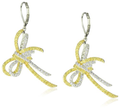 Wrap your ears in sparkling elegance. These CZ by Kenneth Jay Lane Double Bow Cubic Zirconia Earrings feature two glittering ribbon bows: one formed from bright canary-yellow-gold cubic zirconia stones, and the second sparkling with clear white stones. The ribbons wrap around each other for a contrasting, yet complementary, design. Lever-back posts and a rhodium-plated brass setting finish the look. With a 2-inch length, these pretty bows will dangle well below your lobes for "get noticed" impact. Make an entrance by pairing these stunning earrings with a strapless dress and sky-high heels. The essence of "CZ by KJL" collection is to infuse designer details into classic CZ jewelry styling. Our jewelry styles are described as having trend design elements, quality manufacturing and timeless beauty.