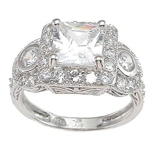 The beauty of a vintage ring without the expensive price tag! Crafted in solid sterling silver, this unique European antique reproduction style ring features a 1 carat cushion cut princess (square) cubic zirconia center stone. The intricate band is detailed with brilliant pave CZ stones. This solid sterling silver ring has been heavily plated in rhodium (a platinum derivative) for years of shine and tarnish free wear.