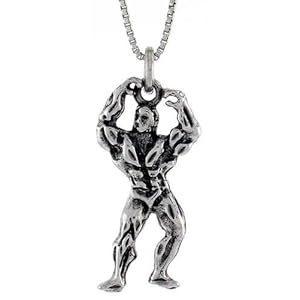 This Sterling Silver " Body Builder " pendant is 1 3/16" (30.0 mm) Long. Well Made, Nice Antiqued Finish and it comes with an 18" Sterling Silver Box Chain.