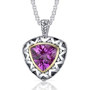 Gemstone: Lab Created Pink Sapphire, Trillion Checkerboard Cut, 7.75 carat Gem Weight, Hot Pink Color Hue, Flawless Clarity with Brilliant Sparkle. Stone is Bezel Set in a 14 Karat Yellow Gold Plated frame. Pendant: Pure Sterling Silver, 8.50 grams, Antique Style Oxidized Design with a hand carved Gallery on the back. Pendant measures 1 & 1/8 inch in Length and 7/8 inch in width. Includes a 18 inch Rolo Style Sterling Silver Chain with a 2 inch extender and Lobster Clasp. Includes a Designer Gift Box and Free Shipping. Style SP9082