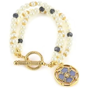 Elegant, simulated pearls give the Vatican Library Collection Windows to Heaven Triple Strand Toggle Bracelet a beautiful, traditional look while special details provide pops of color. Three strands of pearls feature blue crystals as pretty accents while a gold-toned toggle clasp offers a secure closure with a classic look. For a delicate touch, a four-point flower is hand-painted with blue enamel. A small ivory pearl is set into the center of the flower. At 6.5 inches long, the bracelet fits most wrist sizes. A trio of charming strands of simulated pearls are accented with gold tone findings and Montana blue lantern beads. The dangling medallion is hand painted with blue enamel and accented with Montana blue crystals. At the center of the four point flower, an ivory color simulated pearl rests.