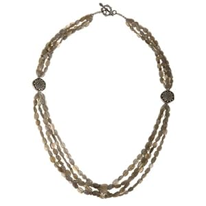 Accentuate your evening wear with a touch of pure elegance when you wear this handmade labradorite necklace. This gorgeous piece is crafted from four strands of translucent labradorite, otherwise known as black moonstone. The gemstones used to craft this piece are cut into slender oval shaped beads and colored with a sleek translucent beige. Two disc shaped silver beads with an intricately etched design are featured at focal points on either side of this creation. The necklace is finished with decorative silver accent beads attached to a simple toggle clasp for easy and secure closure. Measures approximately 23.5 inches long. Labradorite features the luxurious natural sheen that characterizes all shades of moonstone. Accessorize day or night with this unique moonstone necklace for a touch of exotic style. This exquisite creation has been entirely handmade by skilled northern Thai artisans using only the finest hand-picked stones. AsiaEXP scours the globe to bring you authentic, beautiful handicrafts at prices fair to both our valued customers and our talented artisans. By shopping with us, you not only acquire a gorgeous piece of jewelry, you also help to sustain native Thai artisans and support the continuation of ancient creative traditions. The handcrafted nature of this product will produce minor differences in design and sizing. Subtle variations will occur from piece to piece, adding to the unique quality of individual items. Measurements are approximate.