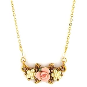 This delicate necklace is feminine and romantic. The gold tone round link chain gracefully encircles your neck with faux seed pearls set at intervals. The pendant is directly linked to the chain on either side. A genuine porcelain rose is set between twin simulated pearl cluster flower settings. Deeply etched gold tone leaves surround the center bloom.
