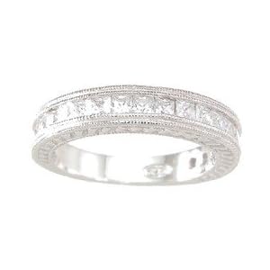 Get the look of white gold without breaking the bank! This vintage style wedding band is accented by channel set cubic zirconia stones and a scrolled antique design. This band is ceated in solid sterling silver and plated in a platinum derivatire for years of tarnish free wear.